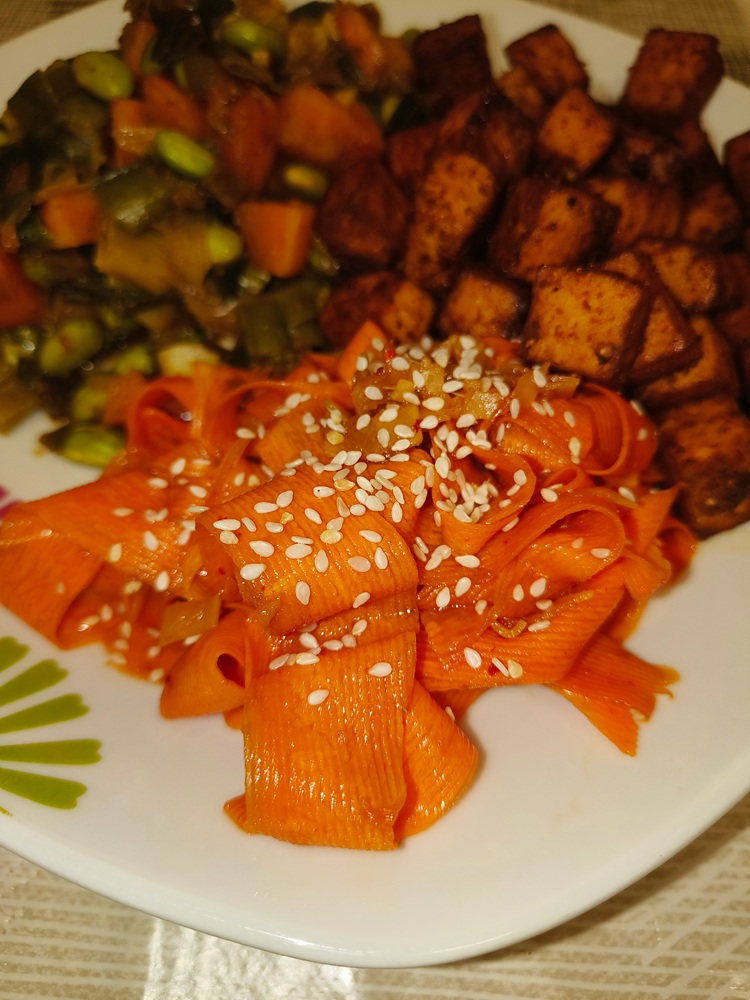 *For carrot noodles: toss carrots in soy sauce, rice vinegar, black vinegar and a dash of agave, salt and pepper. Top with sesame seeds.