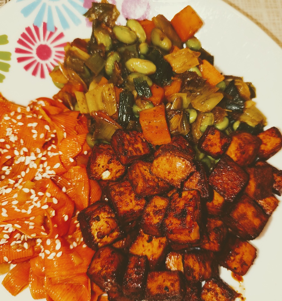 *For the tofu: season the cubes with ground ginger, turmeric, curry, salt, chili powder and black pepper. Sprinkle with soy sauce, Sriracha and a few drops of sesame oil. Place in storage container with a lid and shake like crazy until the tofu is coated. Let it marinate while the oven pre-heats.