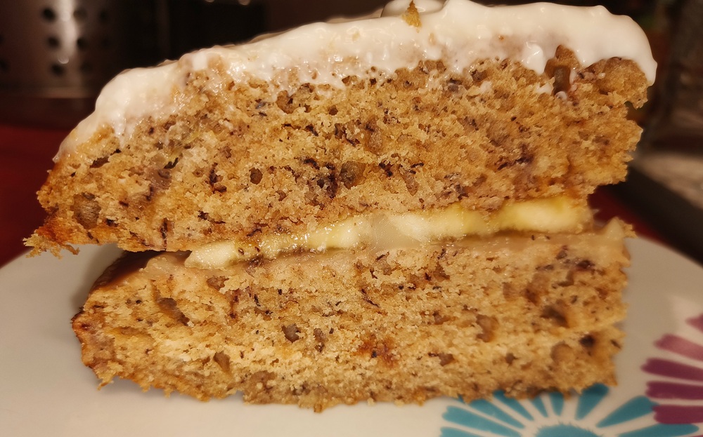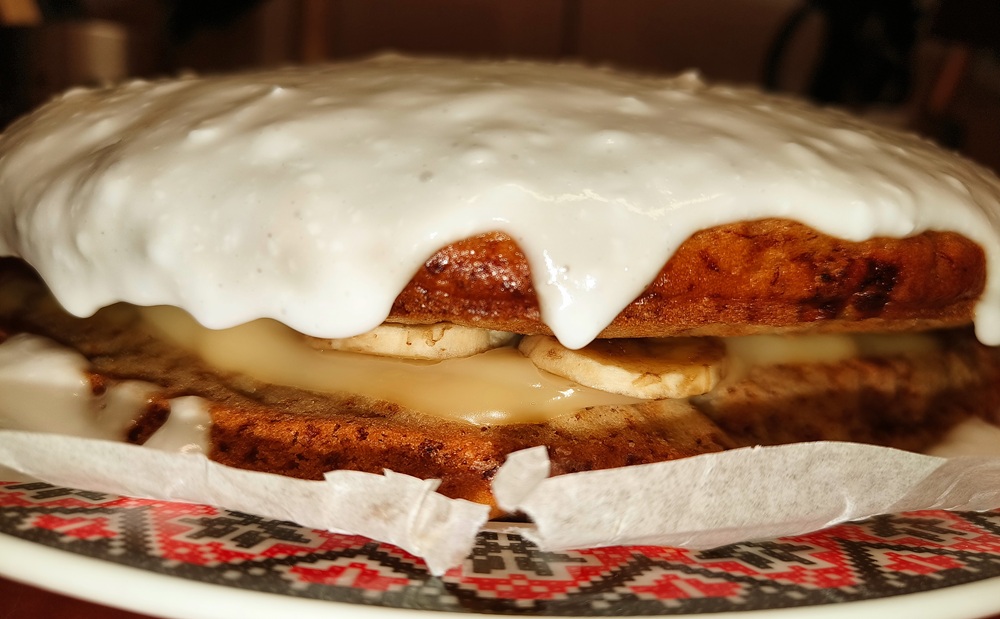 My so-called bright idea was to make the cake banana cake so it was really OTT banana flavor because he loves my banana desserts. The cake came out moist and fluffy and very banana-y without being overwhelming. Source: me, not a banana lover.