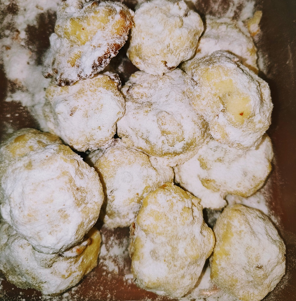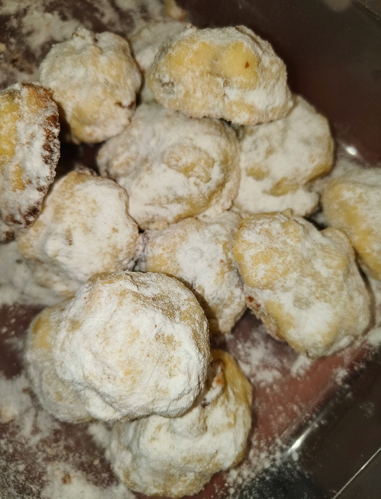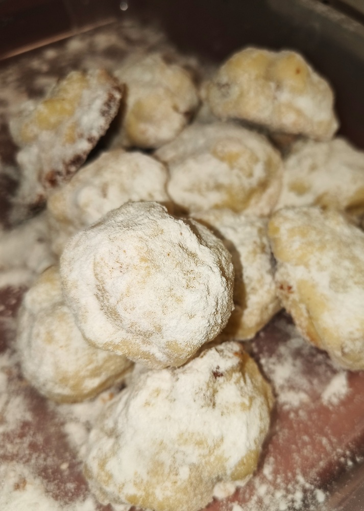*In a small mixing bowl, add more confectioner’s sugar and roll each cookie around in it until completely coated. Return to baking sheet until completely cool.