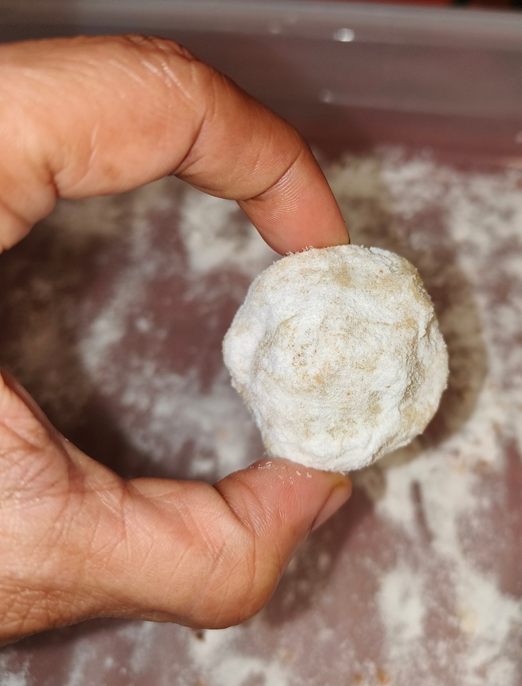 Tip: Roll one batch and then reset by washing your hands. I run pretty warm and after rolling 12 cookies my hands were so warm the dough was getting too soft and sticky.