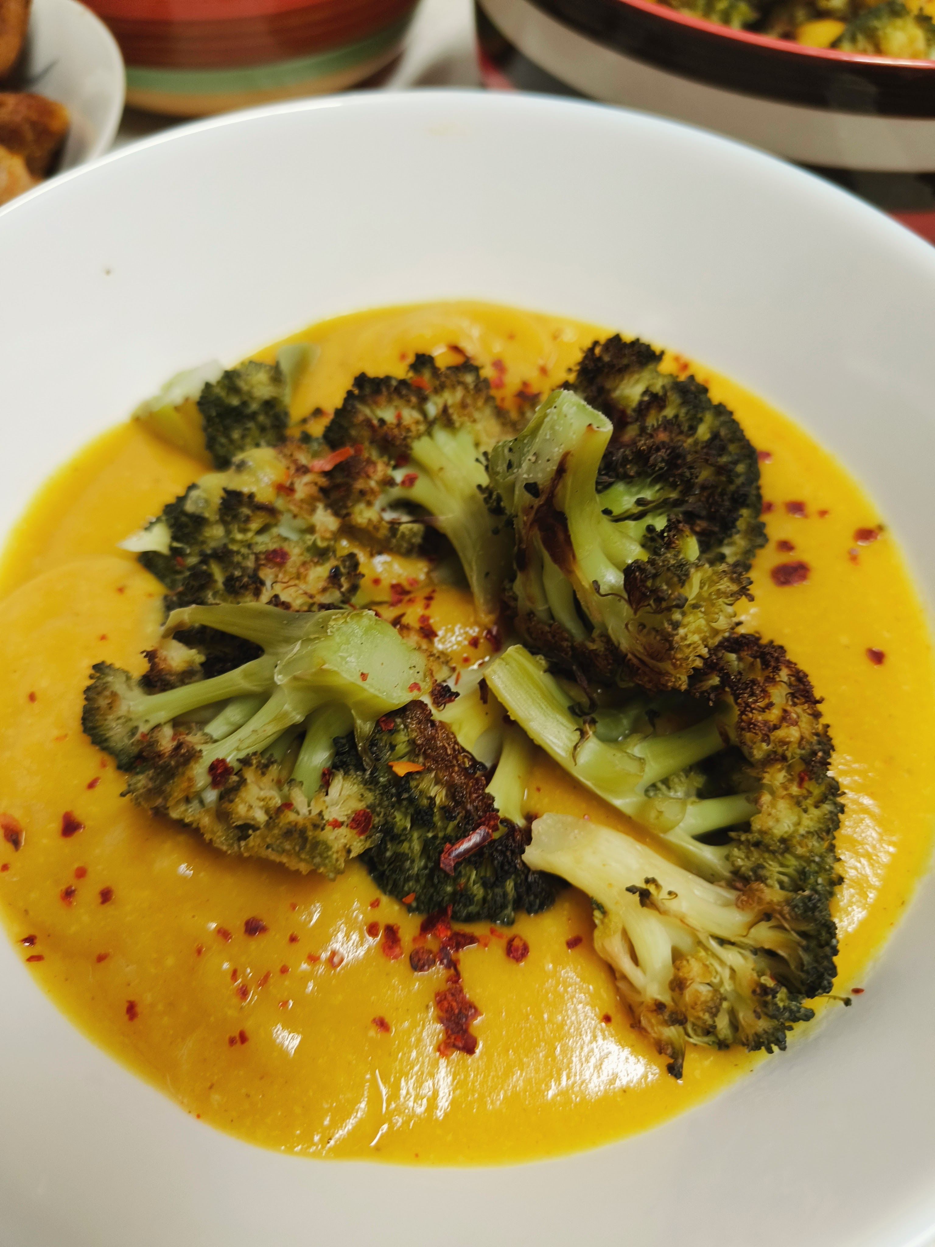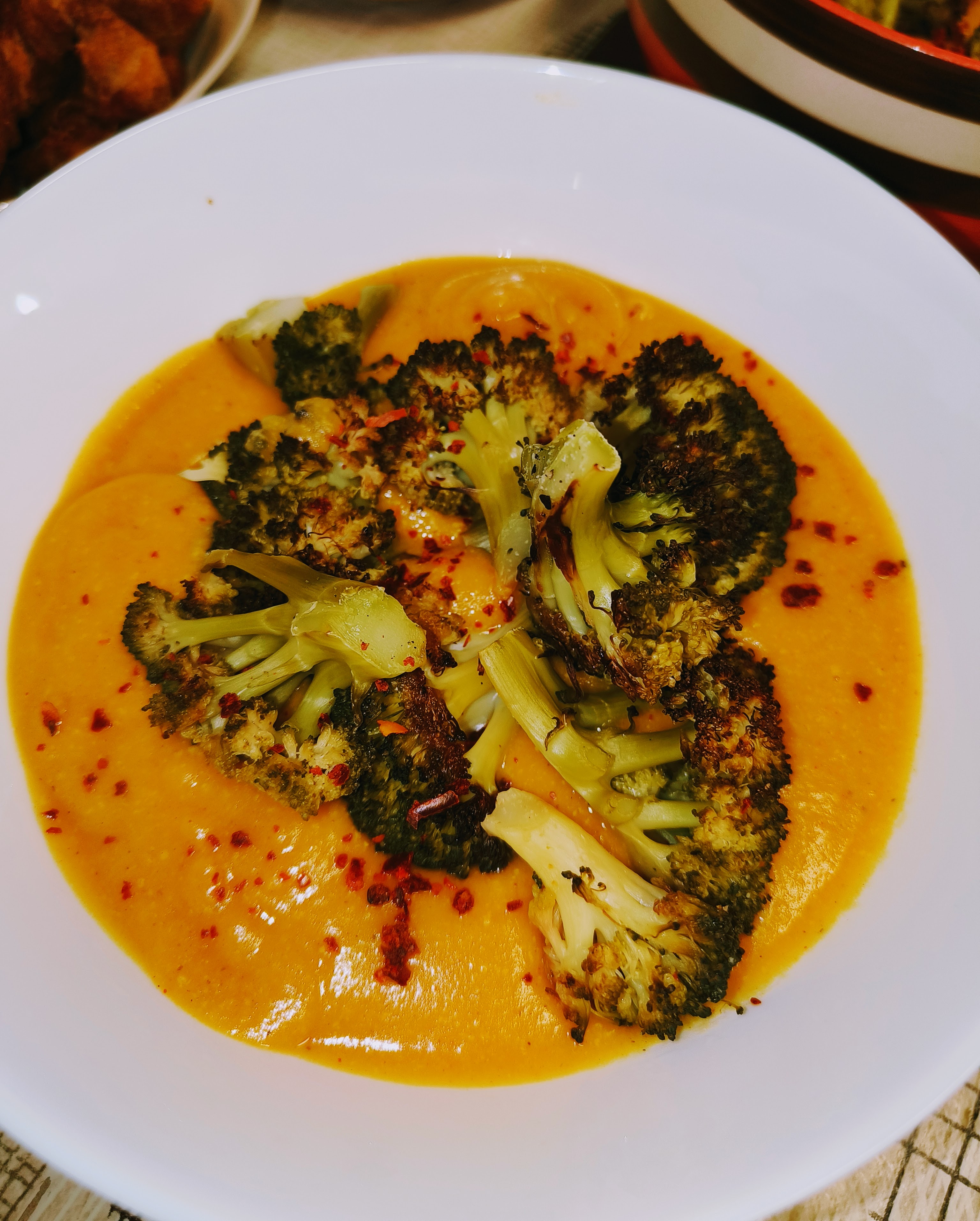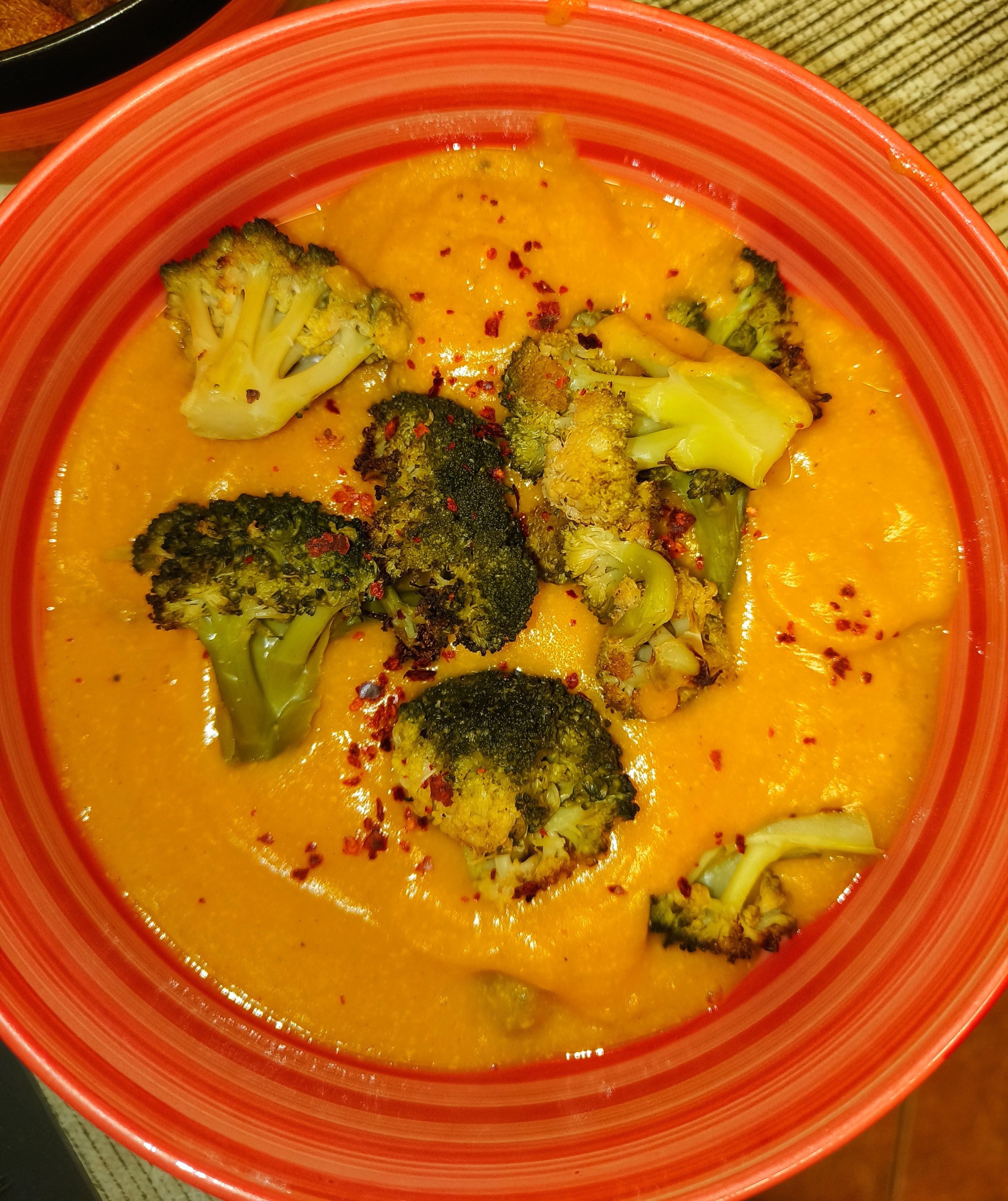 *Warm soup up once it’s smooth, adding more liquid as necessary. Fold in broccoli and serve. Garnish with red chili flakes if desired. I used Korean chili flakes because they were handy, but you do you!