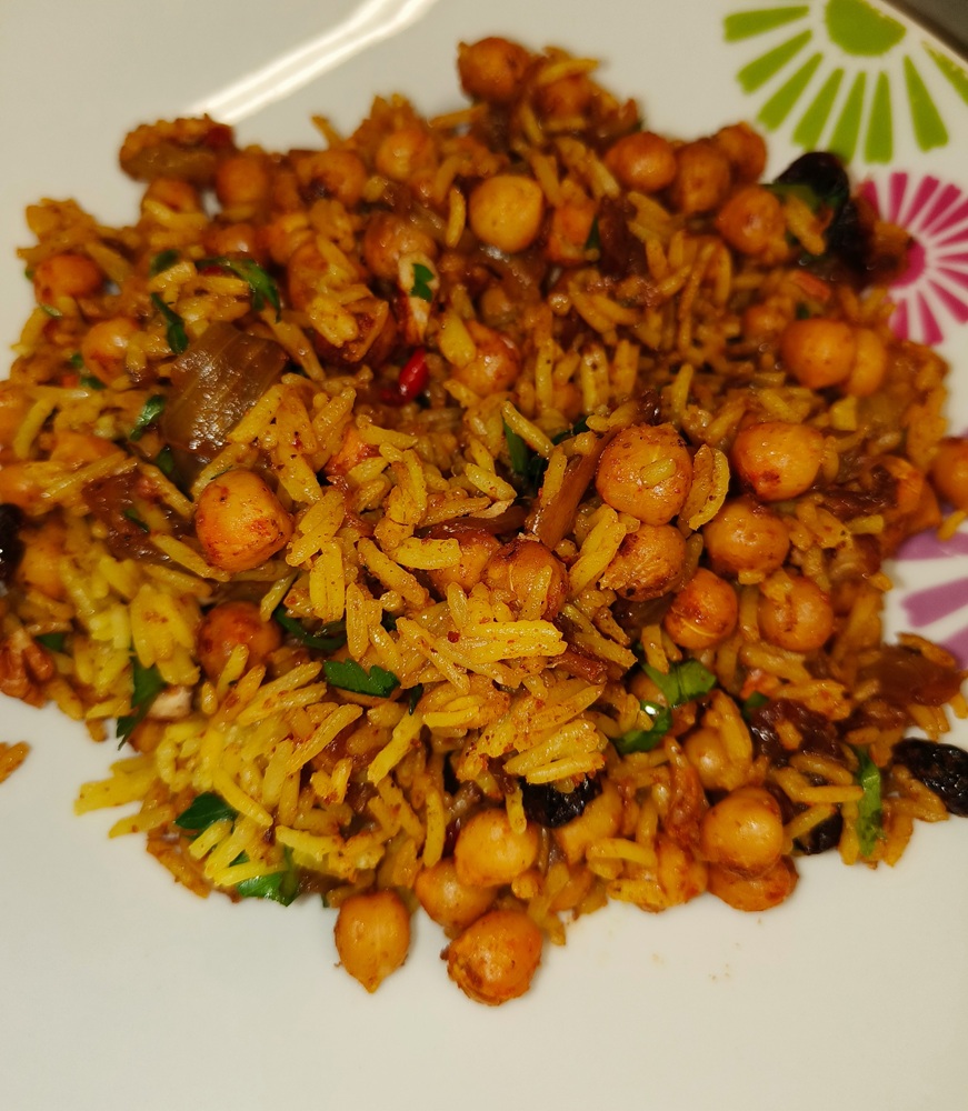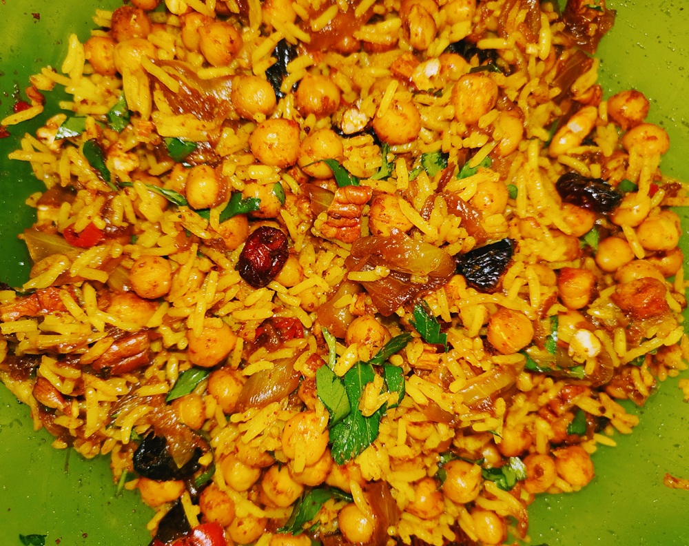 Assemble! Fluff the rice and add it to the bowl along with the chickpeas, and the onions & leeks. Toss until everything is blended and serve. In my house, it’s me & Cos so this made 4 servings for 2 adults at just under 500 calories per serving.
