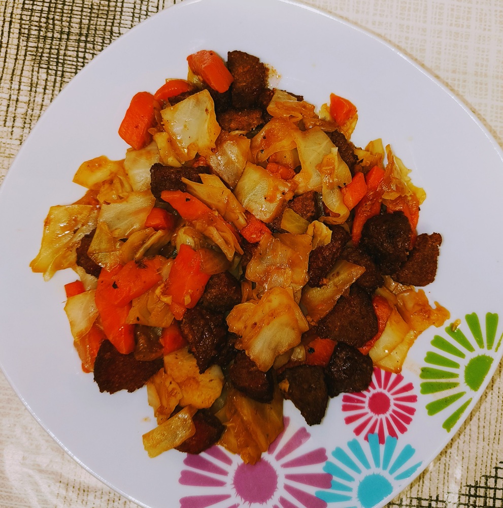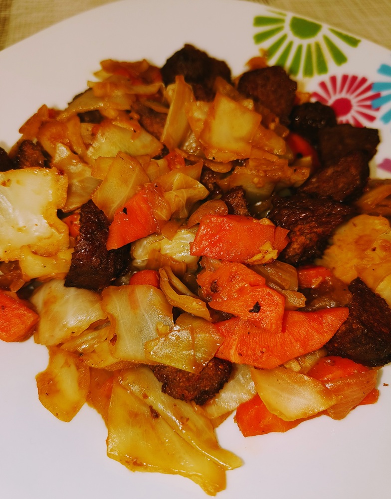 Add in liquid as needed to cook the cabbage. Once all the cabbage is in the skillet, reduce heat to a simmer until carrots and cabbage are soft-ish.